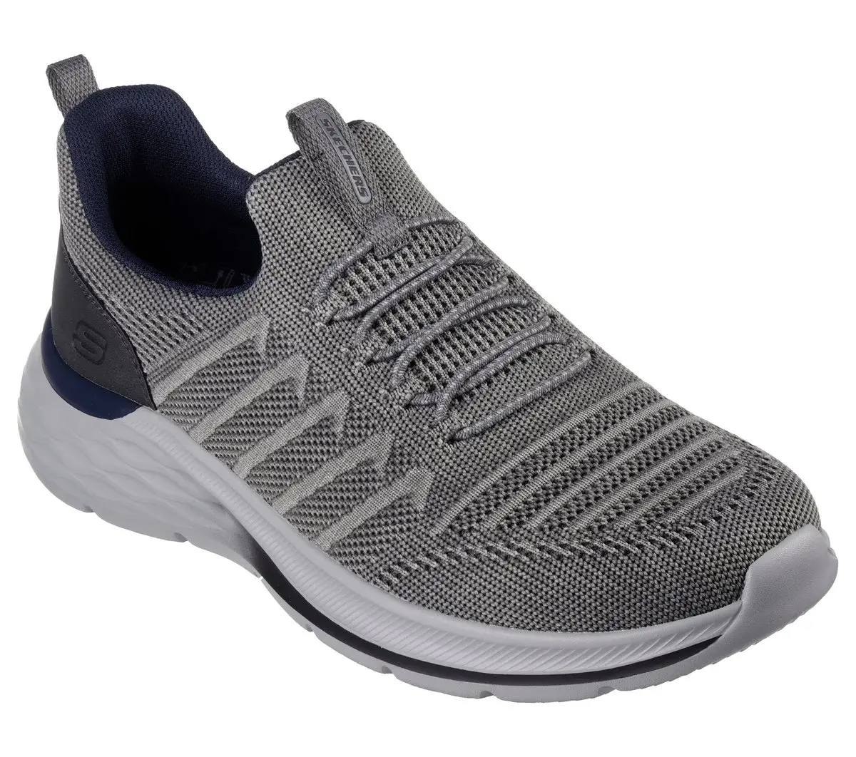 Try your new look in modern comfort and sleek design wearing Skechers Relaxed Fit®: Garner – Crispin. This roomy vegan style features an athletic mesh upper with fixed stretch-laces, a charcoal-infused Skechers Air-Cooled Memory Foam® insole, and Goga Mat Arch™ cushioning for added support.