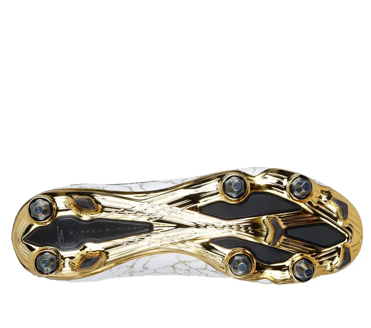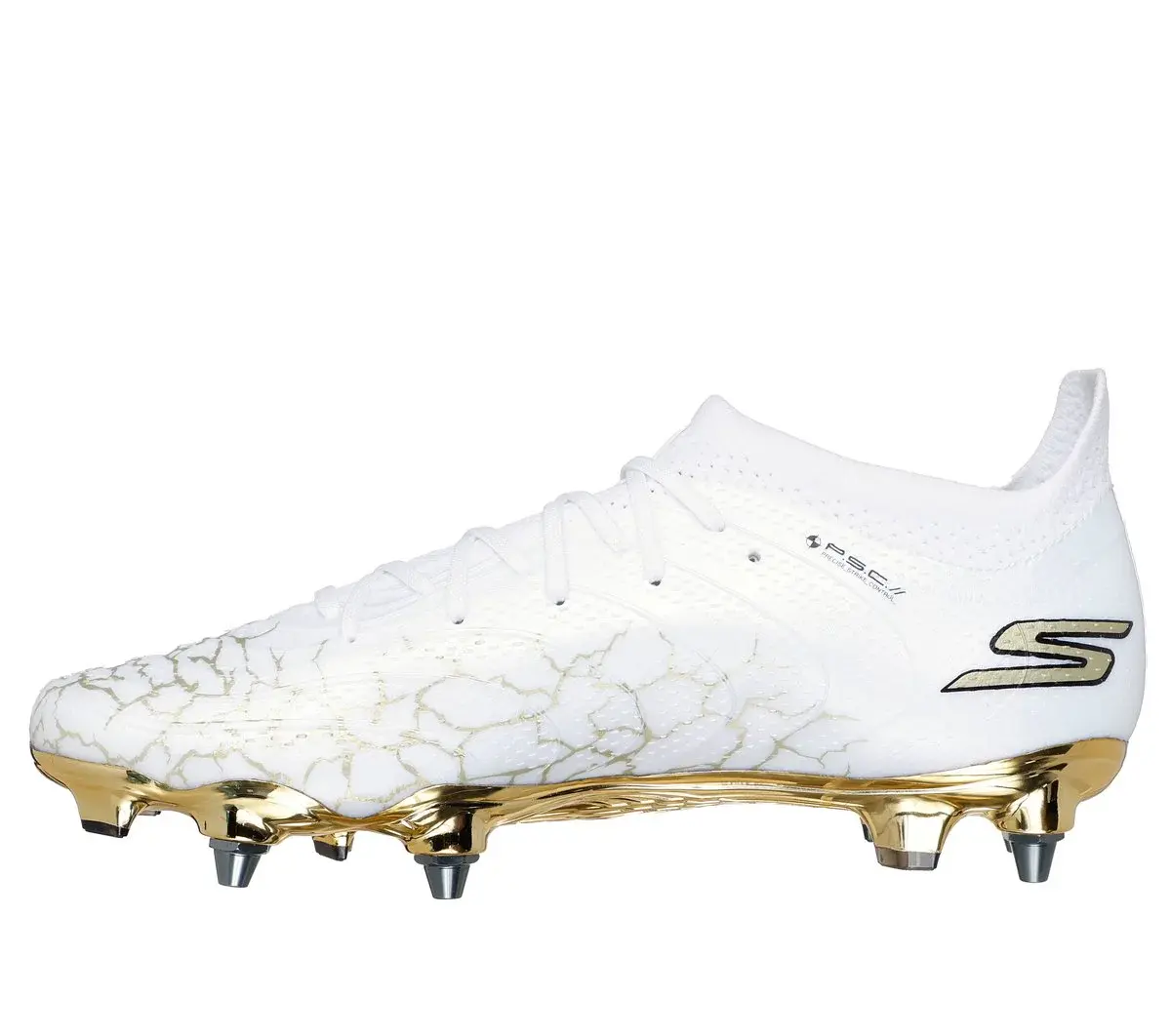 Take to the field in the latest football technology with Skechers Soccer™: SKX_1.5 Elite SG™. This lightweight boot features highly responsive HYPER BURST PRO™ cushioning with a lace-up Performance FitKnit™ engineered upper and P.S.C. molding detail for precise ball control. The multi-directional traction outsole boasts a mixed-stud configuration, specifically designed for soft ground surfaces, ensuring optimal grip and agility on the pitch.