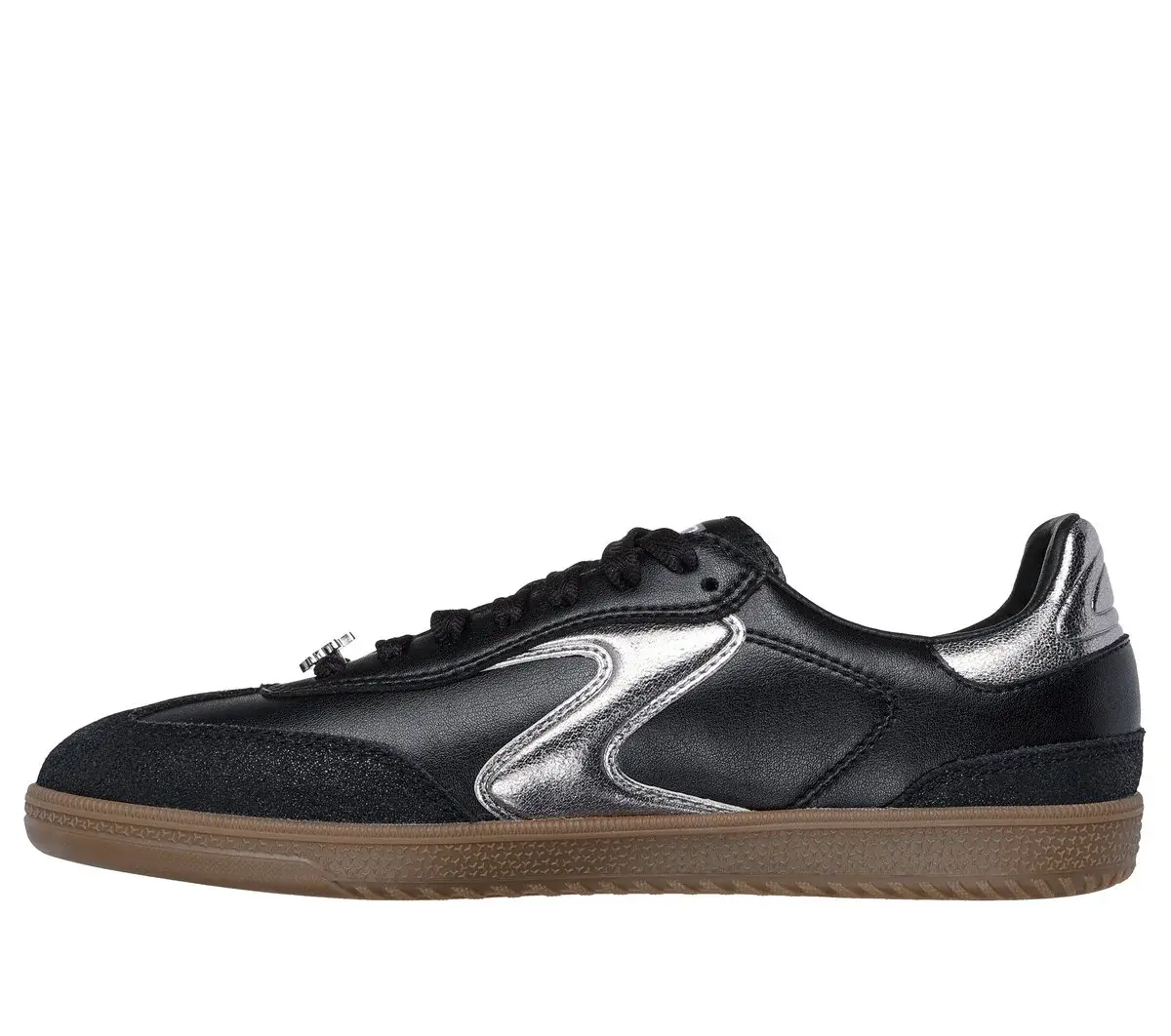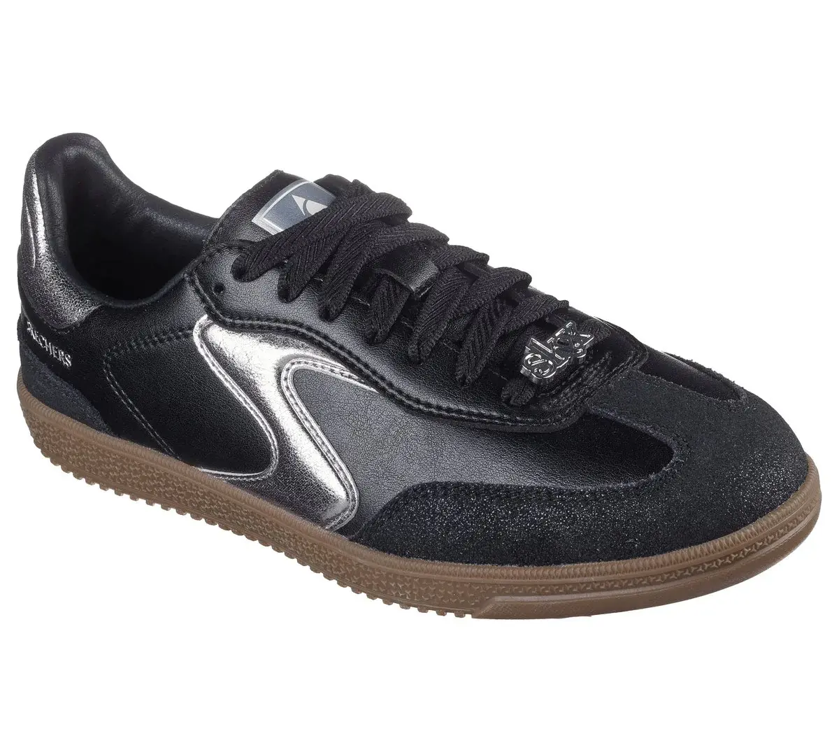 A modern classic meets fresh comfort in Skechers Hotshot – Cool Glow. This lace-up court-style sneaker features a duraleather upper with faux suede overlays, metallic color pop detail, and a cushioned Skechers Air-Cooled Memory Foam® insole.