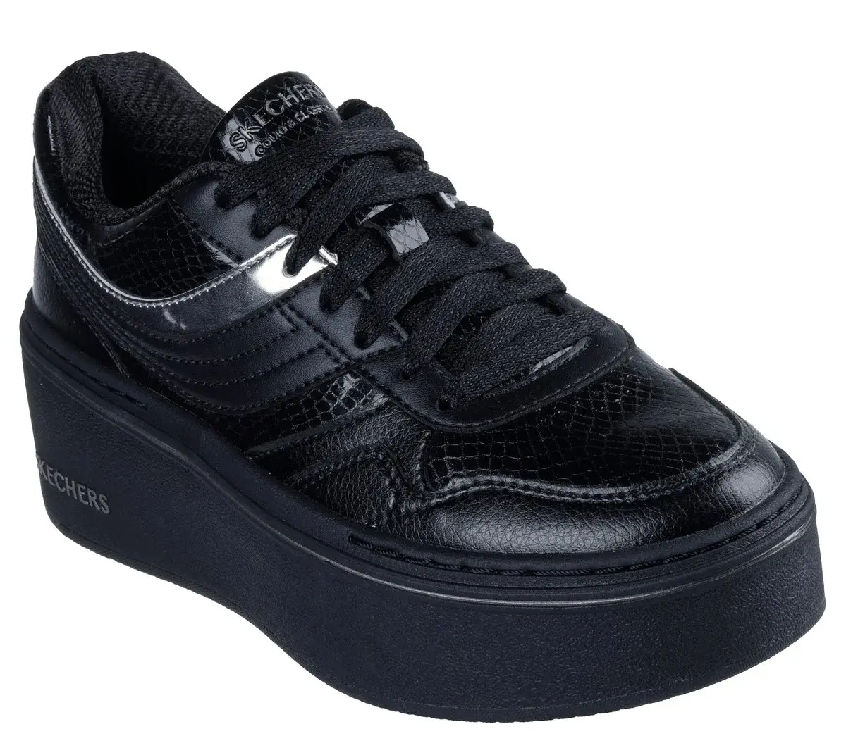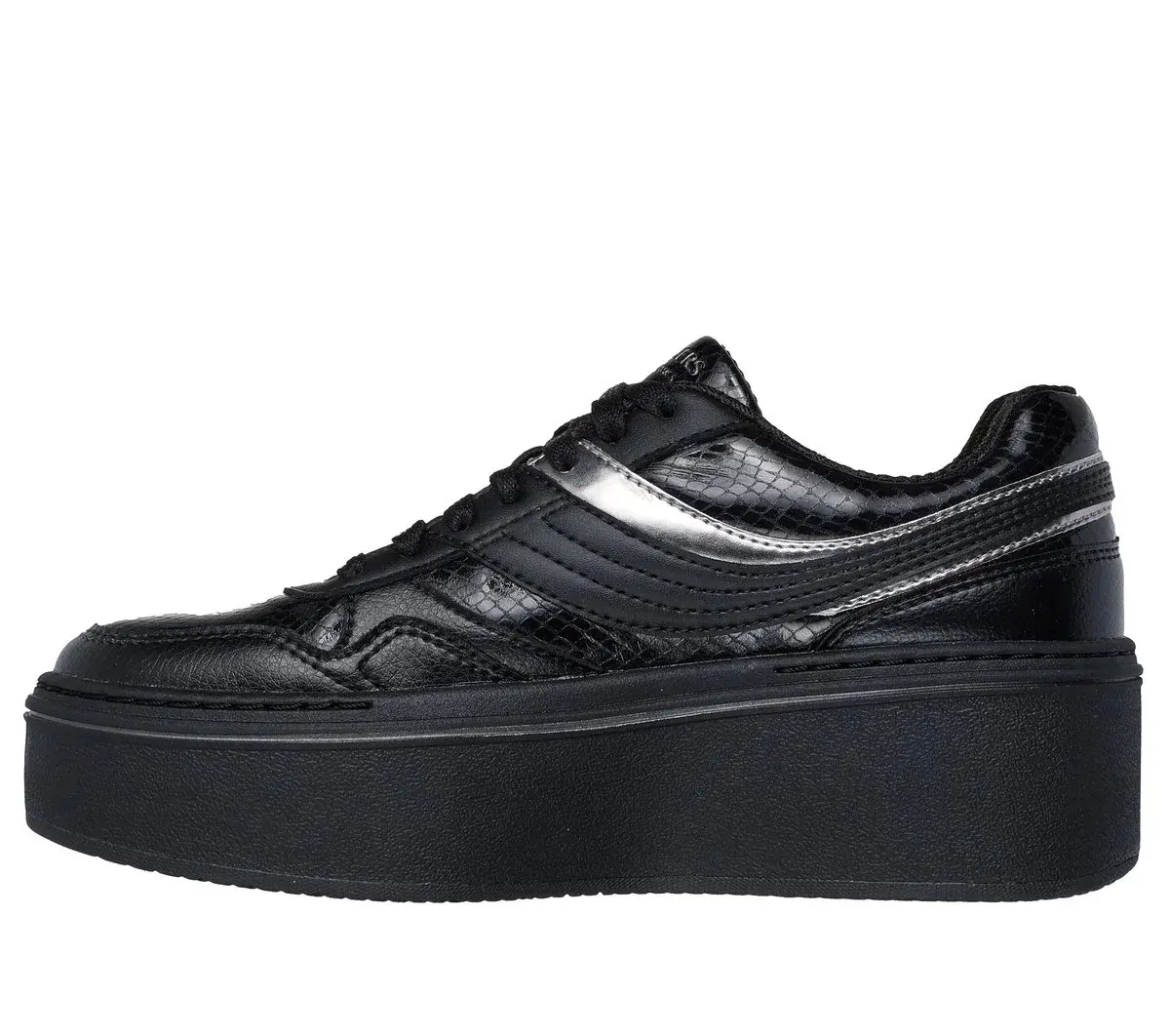 Reach new heights of style with Skechers Paloma – Lifted Glow. This platform court sneaker features a lace-up duraleather upper with reptile textured details and metallic overlays, plus a cushioned Skechers Air-Cooled Memory Foam® comfort insole.