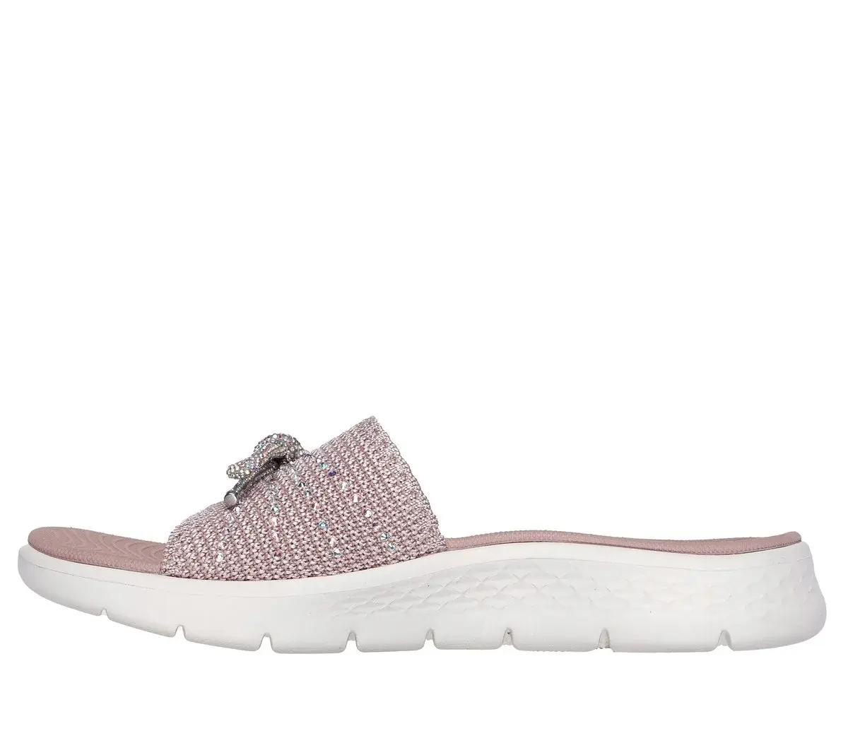 Choose the easy life in laid back style wearing Skechers GO WALK Flex™ Sandal – Stella. This casual comfort slide features a textured knit upper with a rhinestone bow, contoured Goga Mat® footbed, and lightweight ULTRA GO® cushioning.